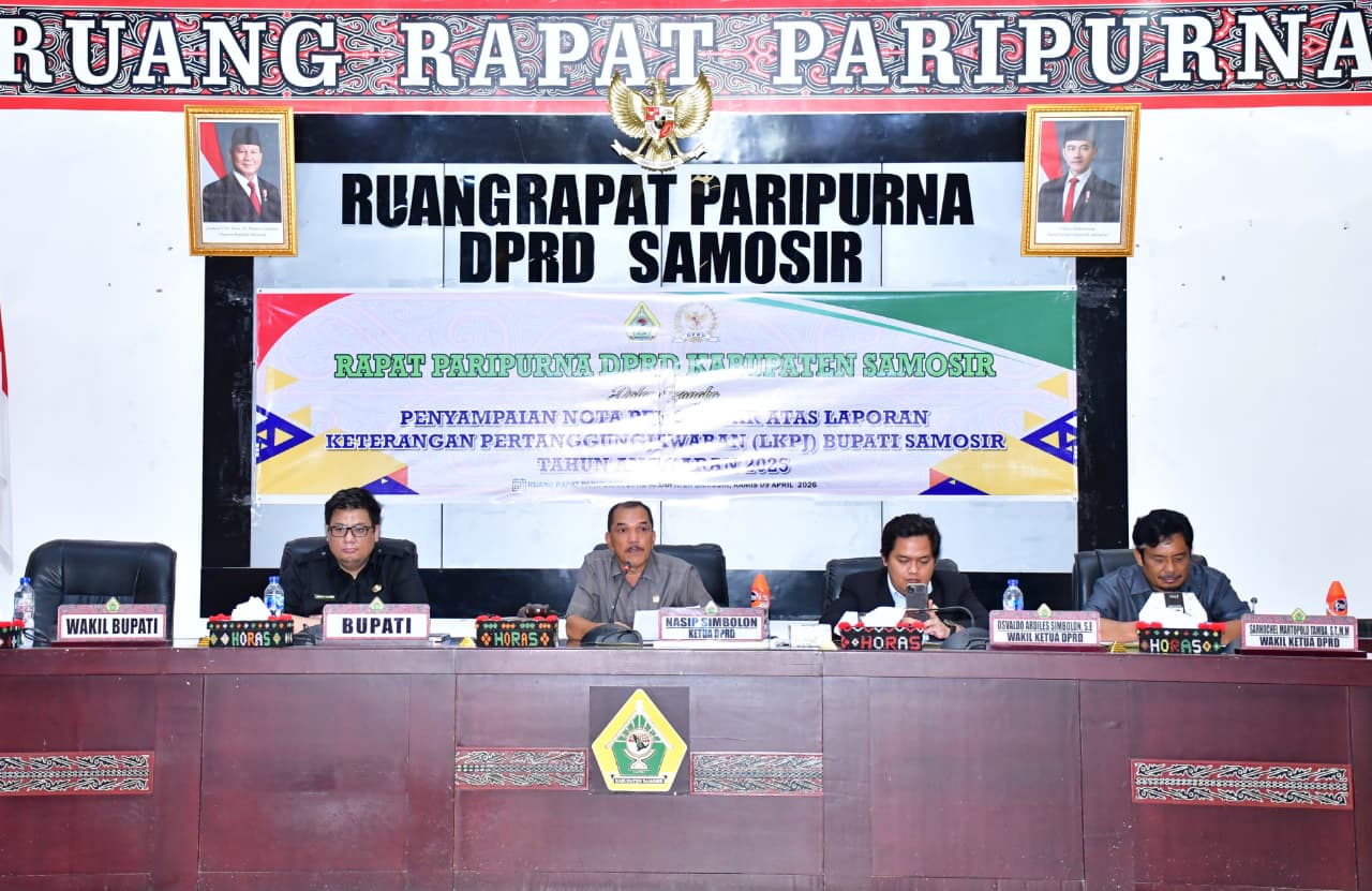Kabupaten Samosir – Bupati Samosir menyampaikan Nota Pengantar Laporan Keterangan Pertanggung jawaban (LKPJ) Tahun Anggaran 2025 dalam rapat paripurna DPRD Kabupaten Samosir yang digelar di Gedung DPRD, 09/04/2026.