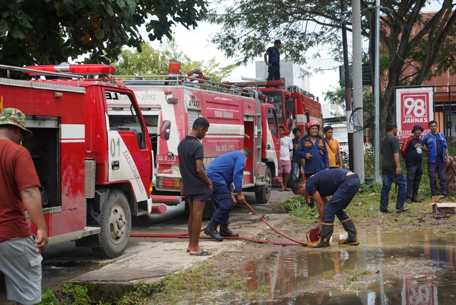 Berkat laporan warga, mobil pemadam kebakaran milik Pemkab Toba berserta personelnya segera meluncur dan memadamkan api yang berkobar di rumah Jefri yang dikenal sebagai Ketua Jarnas ’98 (Jaringan Nasional) Kabupaten Toba.