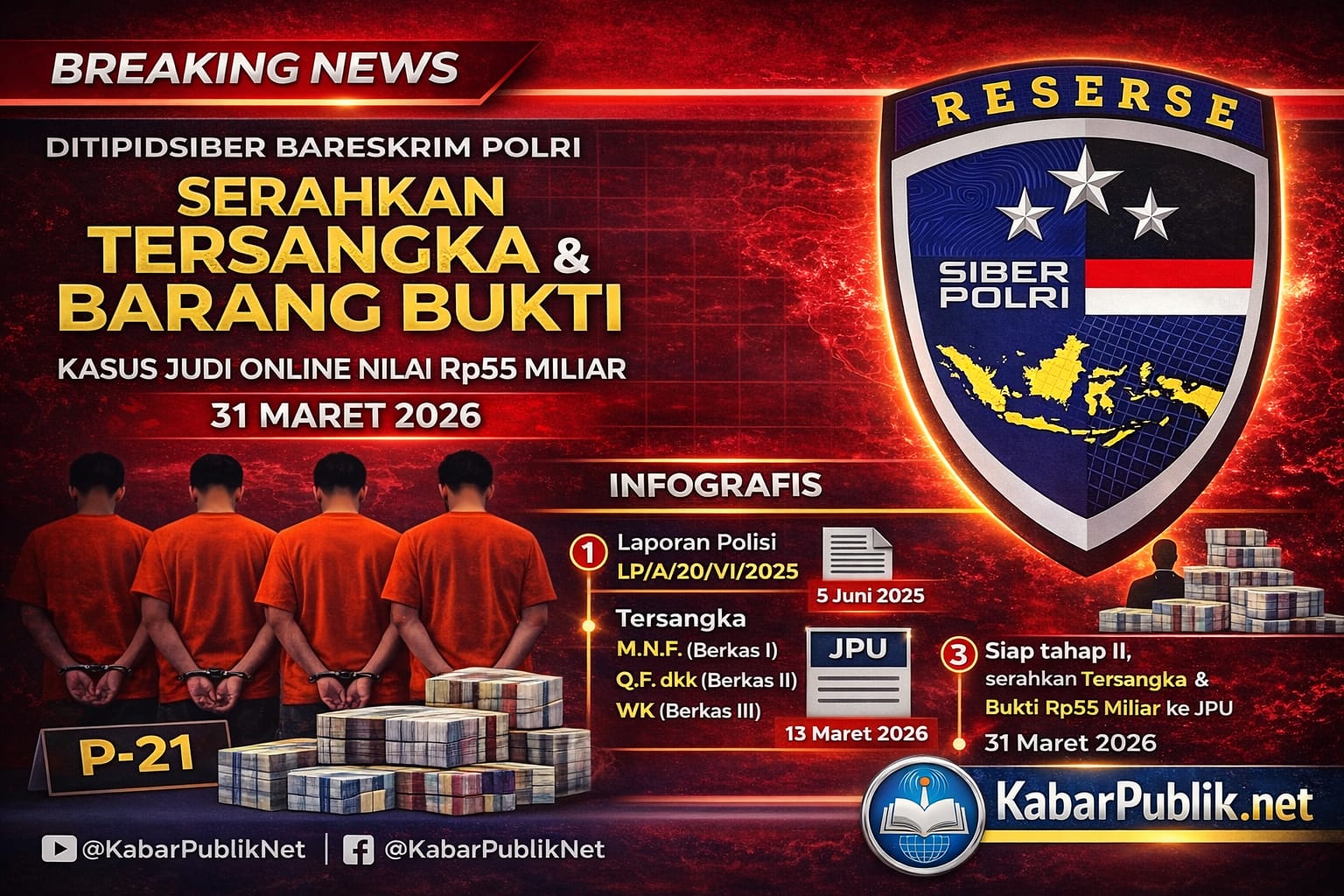 JAKARTA — Kabarpublik.net, Direktorat Tindak Pidana Siber (Dittipidsiber) Bareskrim Polri resmi menuntaskan penyidikan kasus perjudian daring berskala besar dengan nilai mencapai Rp55 miliar. Berkas perkara para tersangka telah di...